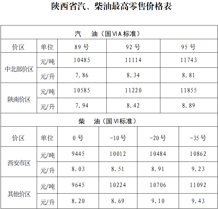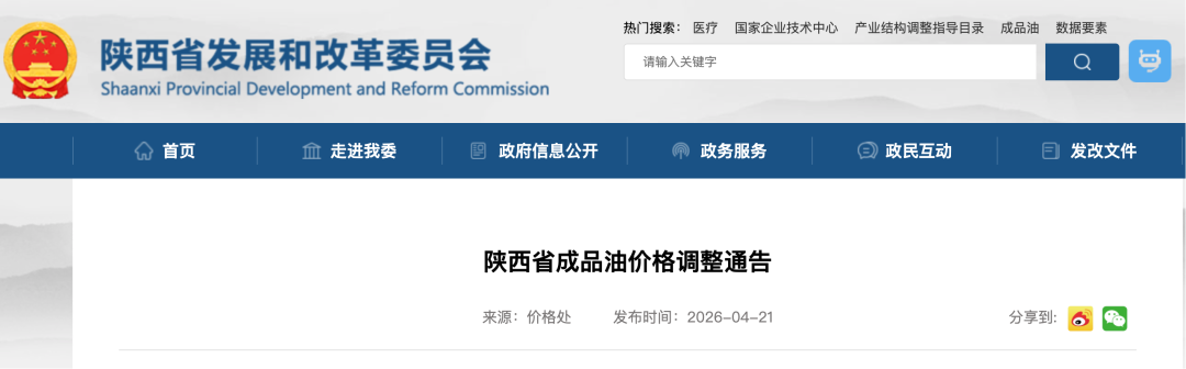 4月21日,陕西省发展和改革委员会网站发布陕西省成品油价格调整通告: