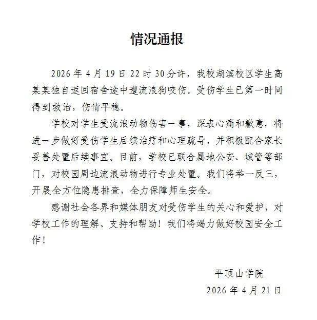 平顶山学院通报学生被流浪狗咬伤:伤情平稳 已对流浪动物进行专业处置
