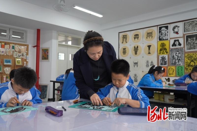 图为迁安市第一实验小学版画社团的老师辅导学生创作版画。