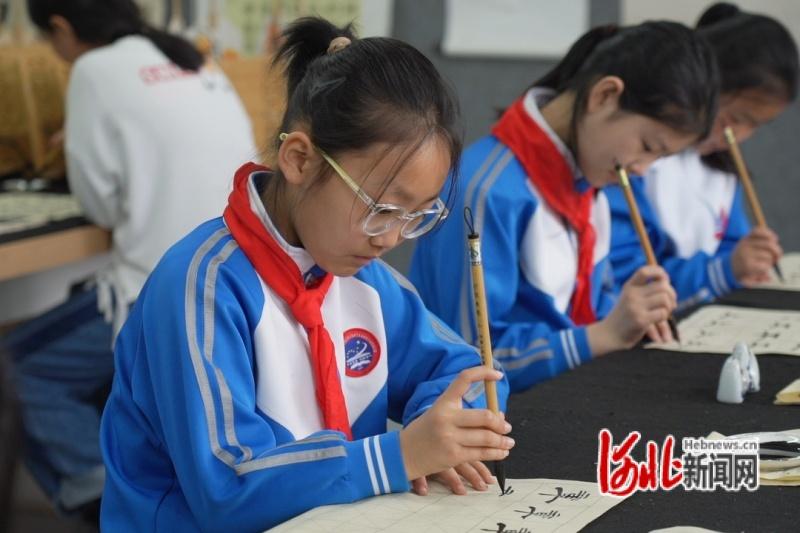 图为迁安市第一实验小学的学生在软笔书法社团练习书法。
