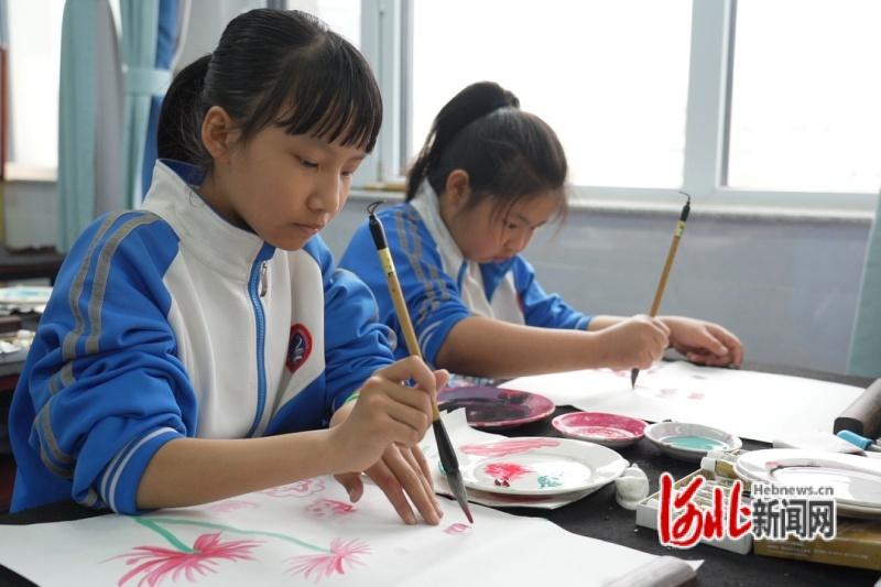 图为迁安市第一实验小学国画社团的学生练习国画。
