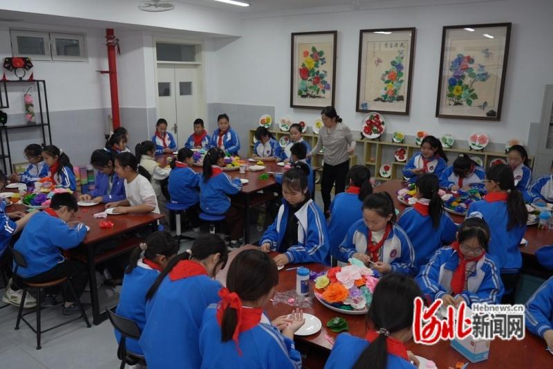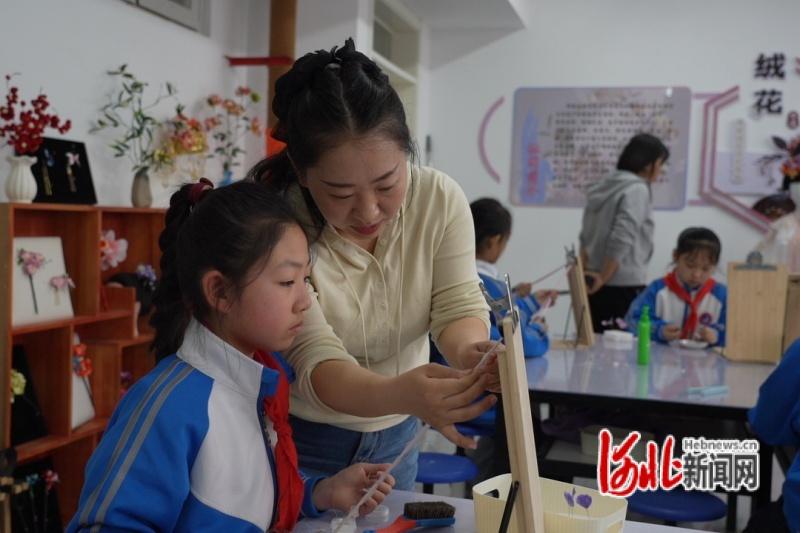图为迁安市第一实验小学绒花社团的老师辅导学生制作绒花。
