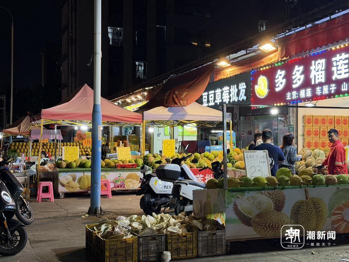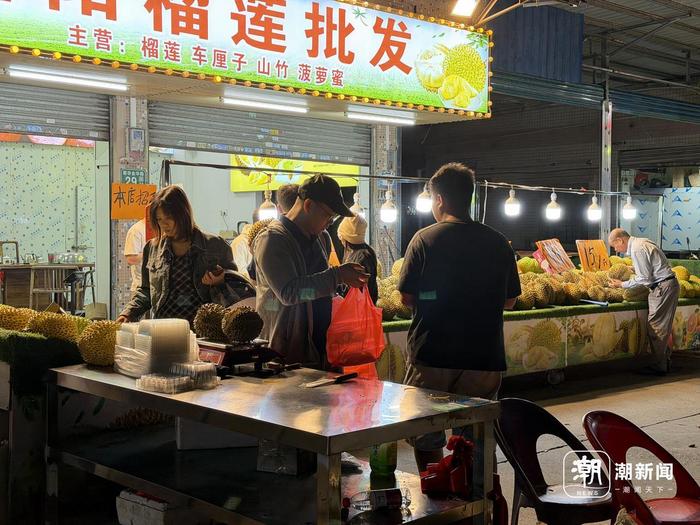 在多姐隔壁摊位,商户浩哥(化名)正在给一位顾客开果。他一边熟练地用刀撬开榴莲壳,一边对记者分析降价的原因,“听供货商说今年泰国那边丰产,货多了自然就便宜。还有就是现在通关快,4天就到了,损耗少,树上熟成本降下来了。”