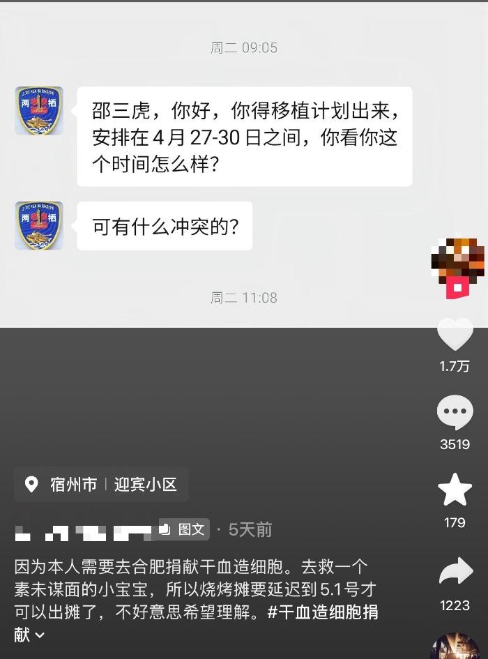 大皖新闻讯 “要去救一个素未谋面的小宝宝,烧烤摊得等到‘五一’才能出摊了。”最近,宿州一位烧烤摊主发的一条视频,让他那个暂时熄火的小摊意外火了起来,而他本人也因这则歇业通知而圈粉无数。4月23日傍晚,大皖新闻记者联系上摊主邵三虎,目前他已在合肥办理住院,正为捐献做最后的准备。