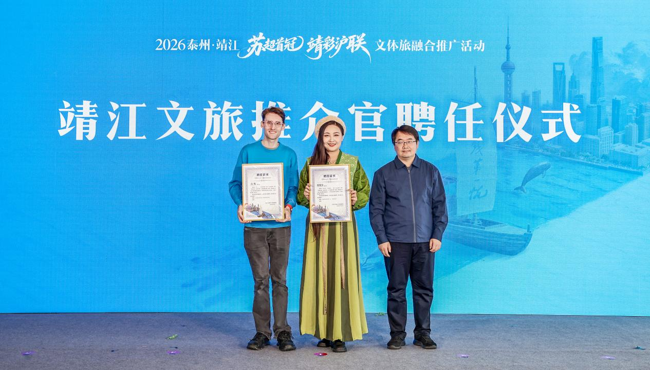 来沪10年的比利时音乐人高悦已然是一位“中国通”。今年,他在结束一段时间的高强度巡演后,选择将靖江作为放松目的地。一天的行程内,高悦不但打卡了蟹黄汤包、“靖江咖啡”粯子粥等特色美食,还逛吃了季家市非遗集市,并用上海方言制作解说视频在网络平台发布,国际化的视野、年轻化的表达、沉浸式的体验,一经发布便引发广泛关注。活动现场,他和另一位古风文旅博主徐悦尔一起受聘成为靖江文旅(上海大都市圈)推介官,将以独特视角宣传靖江人文底蕴。