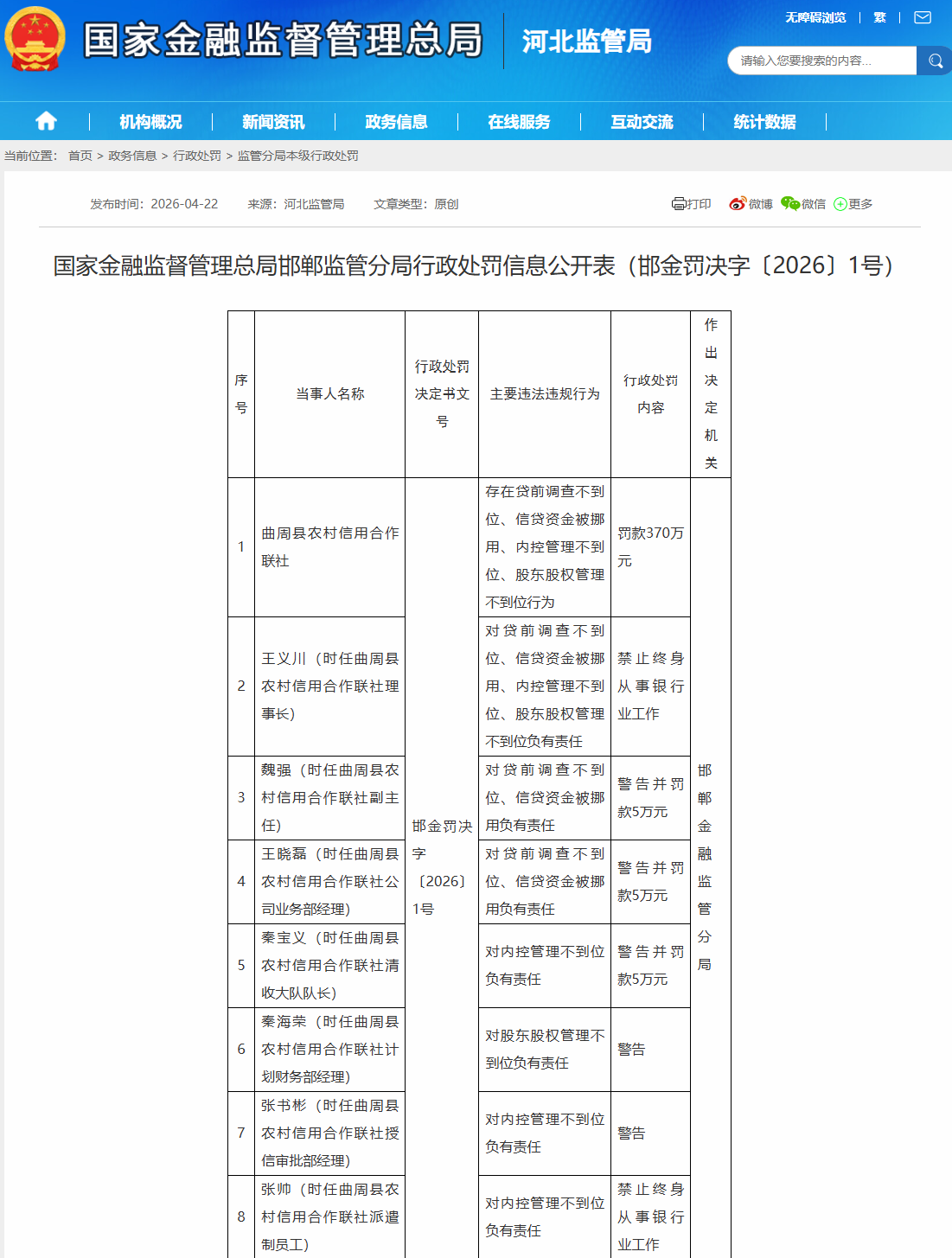 近日,国家金融监督管理总局邯郸监管分局(以下简称“邯郸监管分局”)发布一则行政处罚信息(邯金罚决字〔2026〕1号),因多项违规曲周县农村信用合作联社被处以罚款370万元,及多名相关责任人被追责。