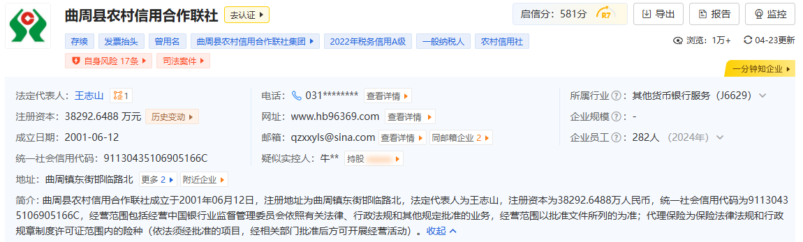 据启信宝显示,曲周县农村信用合作联社(曾用名:曲周县农村信用合作社联合社),成立于2001年,位于曲周镇东街邯林路北,法定代表人为王志山,注册资本38292.6488万人民币,经营中国银行业监督管理委员会依照法律、行政法规和其他规定批准的业务等。