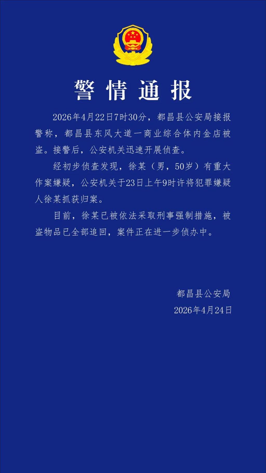 江西都昌警方通报金店被盗:嫌疑人已被采取刑事强制措施