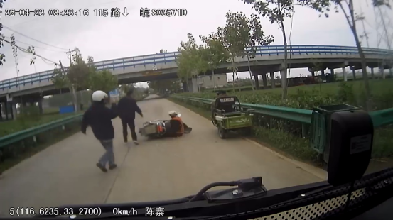 事发当时,115路公交驾驶员秦强正开展全天营运工作,车辆平稳行驶至蒙城县王集乡陈寨公交站台主干道路段。秦强行车途中保持高度专注,及时发现机动车道内突发意外,一名老年村民骑行电动车途中意外失控侧翻,整个人被车辆压在路面,无法自主起身脱困。该处地处城乡通行要道,早高峰车来车往、视线盲区较大,后方车辆车速较快,老人滞留车道中央,随时可能遭遇二次碾压碰撞,现场险情迫在眉睫。