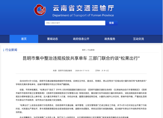 值得关注的是,就在前不久,松果出行刚因同类无牌违规投放行为,在昆明被多部门联合查处。2026年4月16日,昆明市交通运输局发布官方通报,明确自4月13日起,陆续接到市民举报,当地多个区域出现大量松果出行无牌共享电单车,经查该企业违反《中华人民共和国道路交通安全法》《昆明市互联网租赁自行车管理办法》等多项规定,擅自强行投放大量未办理审核登记及上牌手续的共享电单车,且存在车辆无序停放挤占公共空间的问题。4月15日,昆明市交通运输、城市管理、公安交管三部门已联合约谈松果出行,对其提出严肃批评,责令限期清理回收全部违规投放车辆,逾期未整改将依法采取行政强制措施。记者同时了解到,在2026年2月昆明市主城区互联网租赁自行车运营服务主体公开选取中,松果出行运营主体北京阿帕科蓝科技集团有限公司并未入围最终名单。