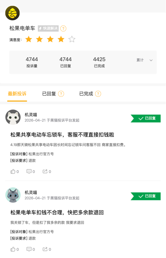 此外,记者发现,松果出行消费投诉同样值得关注。黑猫投诉数据显示,平台内关于松果出行的用户投诉量较大,累计达4700多条,核心问题集中在未骑行被扣费、车辆故障、计费异常、收费过高、拒绝全额退款等方面。