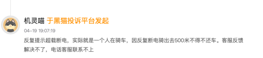 还有消费者反映了松果出行电单车的故障问题:“反复提示超载断电,客服反馈解决不了,电话客服联系不上。”