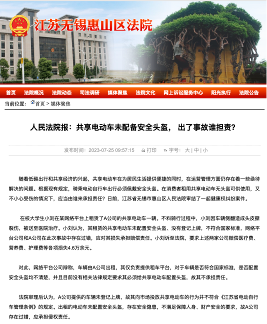 此外,记者了解到,如果骑行无牌共享电动车发生交通事故,责任划分更为复杂。从日前江苏省无锡市惠山区人民法院审结的一起案件,我们或许可以获得相关启示。在校大学生小刘在某网络平台上租赁了一辆A公司的共享电动车。不料在骑行过程中,小刘因车辆侧翻造成头皮撕裂伤,后被送至医院治疗。小刘认为,其租赁的共享电动车未配置安全头盔、没有登记上牌,不符合国家标准,网络平台公司和A公司在此次事故中存在过错,应对其损失承担赔偿责任。小刘诉至法院,要求上述两家公司赔偿医疗费、营养费、护理费等各项损失46000余元。法院经审理认为,A公司提供的车辆未登记上牌,故其向市场投放共享电动车的行为并不符合《江苏省电动自行车管理条例》的规定;出租的共享电动车未配置安全头盔,存在安全隐患,不满足保障人身、财产安全的要求,故A公司存在过错,应承担侵权责任。