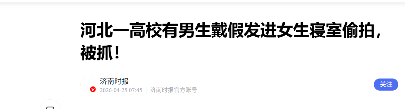 4月24日,华北电力大学保定校区多名学生在社交平台发帖称,该校一名男生戴假发潜入女生宿舍楼厕所,被当场抓住。“听说他在3楼厕所隔间笑出了声音,才被同学揪出来”。该校女生还提到,涉事男生手机里除了照片,疑似有专门分享、倒卖视频的群聊。不过,该信息未能得到证实。目前,当地派出所已将其带走调查。