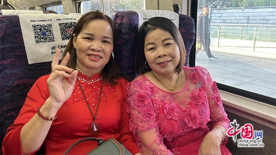2025年12月27日,越南籍游客林氏云(左)与同伴专门乘坐高铁从东兴前往柳州游玩,庆祝国门城市东兴迈入“高铁时代”。封荣权 摄