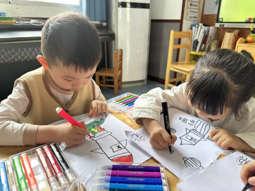 趣味创作环节中,孩子们化身小小航天家,拿起画笔大胆构思、自由创作。一幅幅色彩斑斓的航天绘画作品陆续完成,浩瀚星空、腾空火箭、神奇飞船、可爱的太空宇航员跃然纸上,充满童真与想象力。在航天小制作活动中,幼儿利用手工材料,动手拼搭、粘贴制作火箭、卫星等航天手工作品,动手动脑相结合,沉浸式体验创作乐趣。
